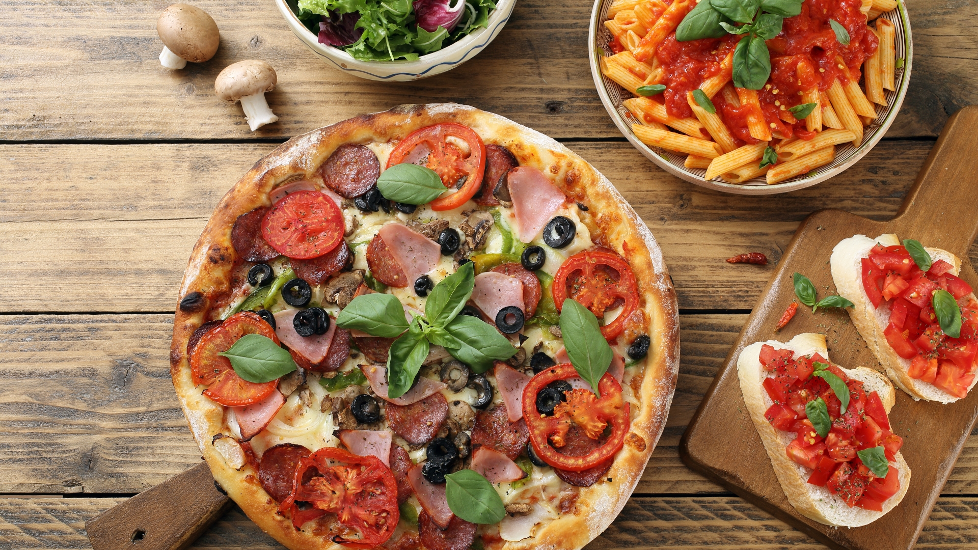 PIZZA JOHN Tomate cherry, rucula, queso parmesano, aceitunas negras y mozzarella fresca. |